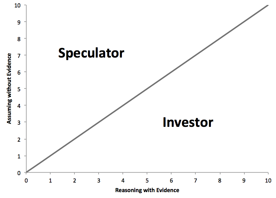 In Figure 1 shown above, we look at what contributes to speculating as opposed to investing. We number each axis from 0 to 10. An ideal investor would base there stock purchase purely on reasoning with evidence; that is their reasoning with evidence is at 10 and their assuming without evidence is at 0. I recommend always staying on the “Investor” side of the curve. This means that for every purchase you make, you have sound reasoning with strong evidence to support your decision. In saying this, everyone tends to speculate a little. It is in our human nature.